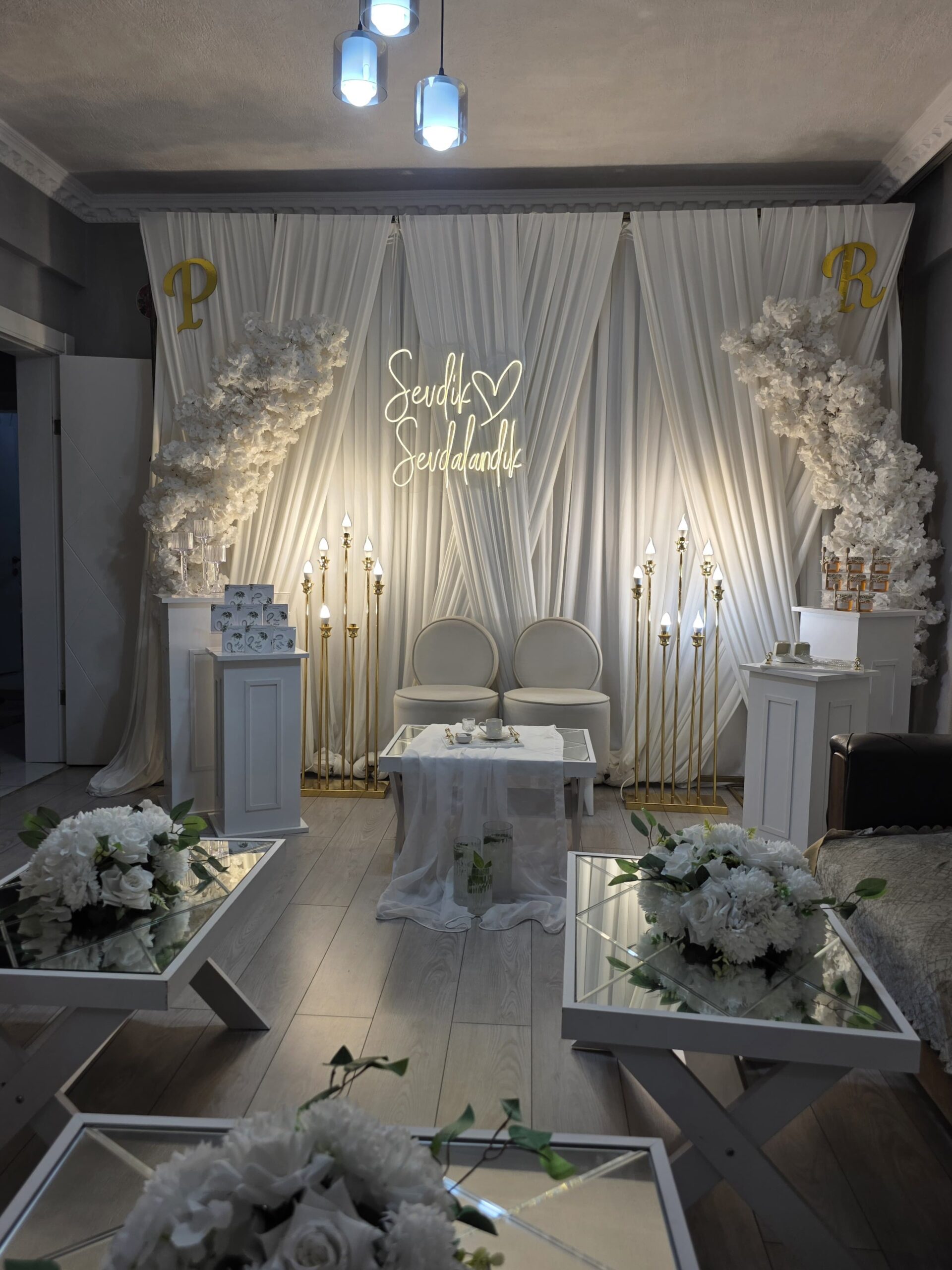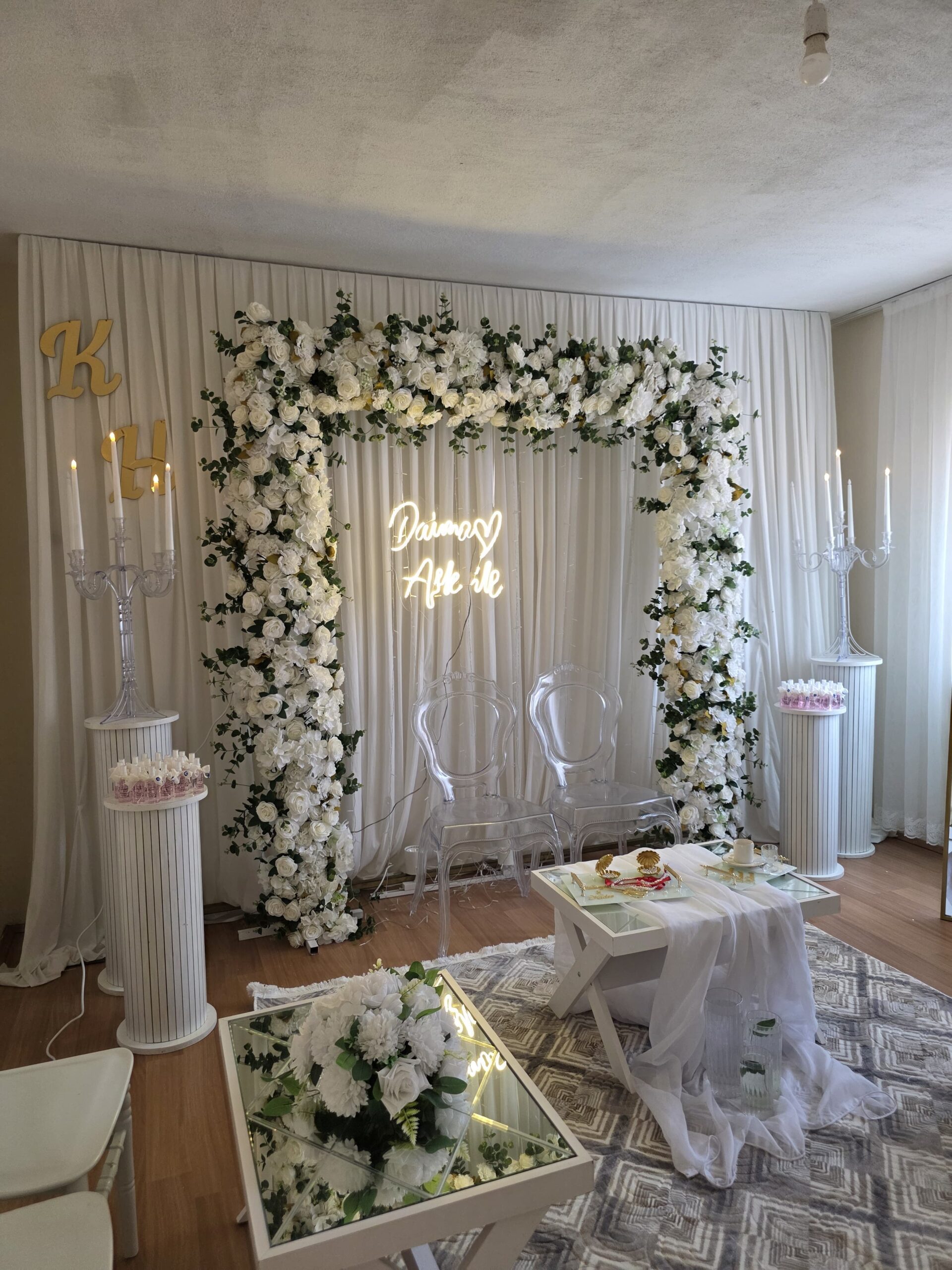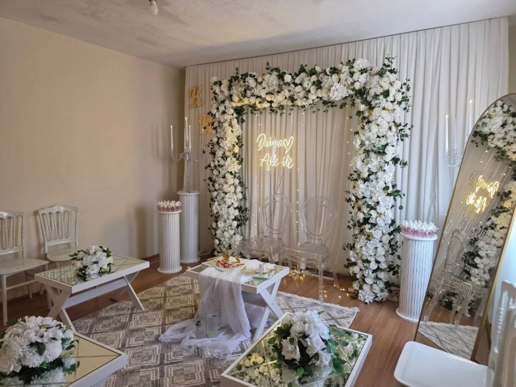 Konsept tasarımıyla birlikte mekan süsleme, masa-sandalye düzeni, sahne kurulumu ve fotoğraf alanı gibi tüm detayları profesyonel ekibimizle hazırlıyoruz. İsterseniz söz ve nişan için özel fotoğraf-video çekimi ve misafir karşılama alanı düzeni de dahil edilir.